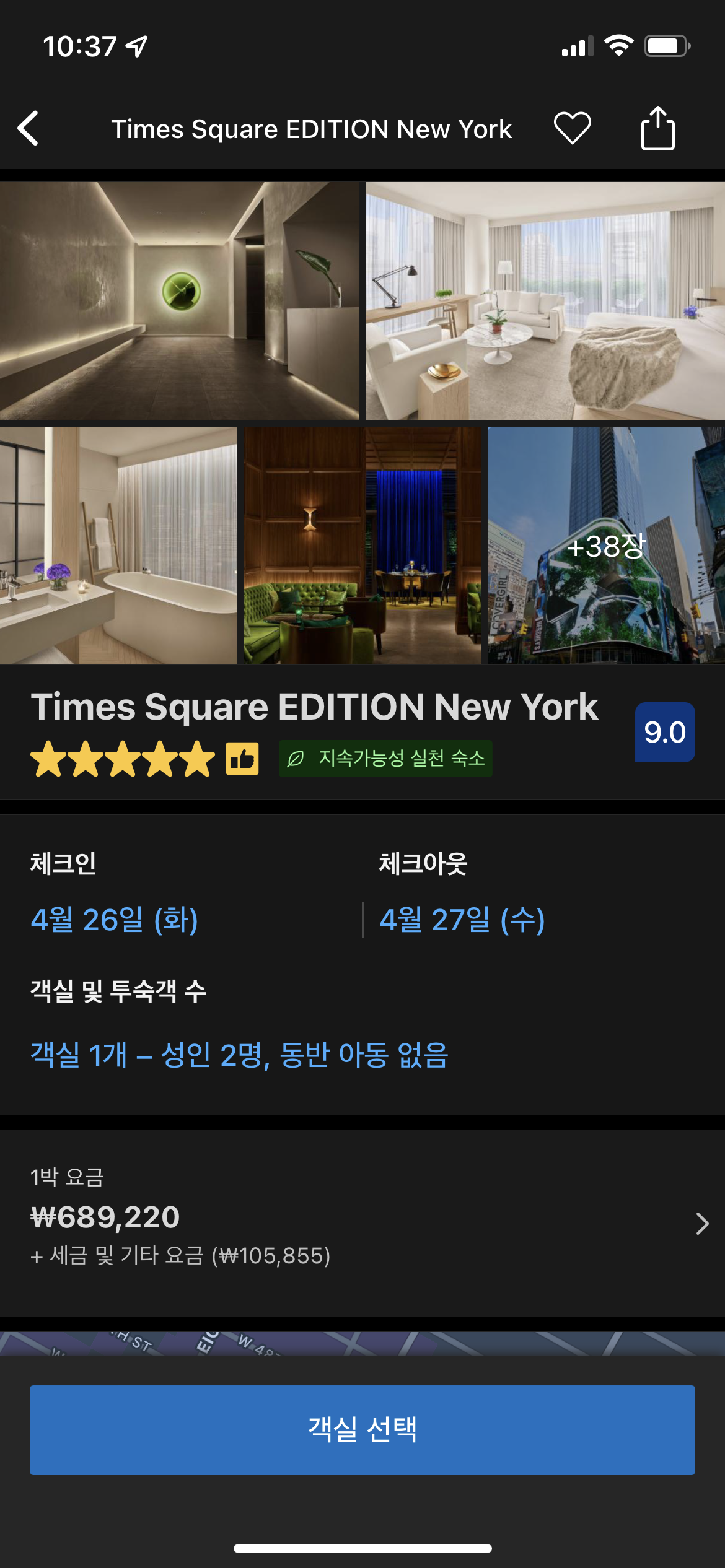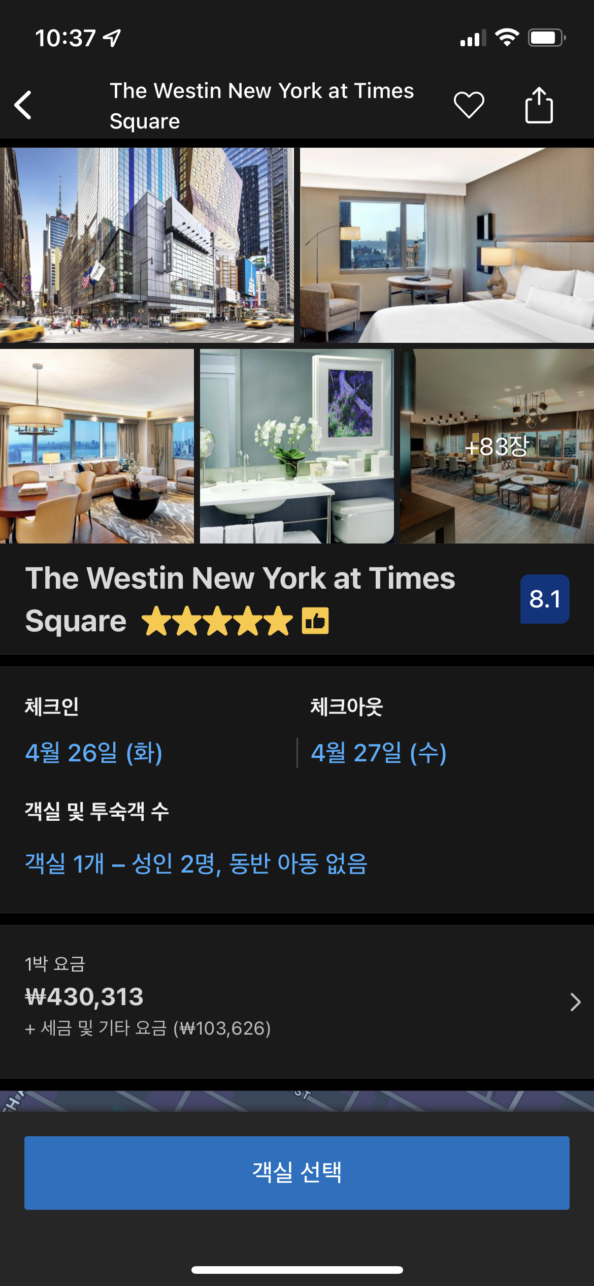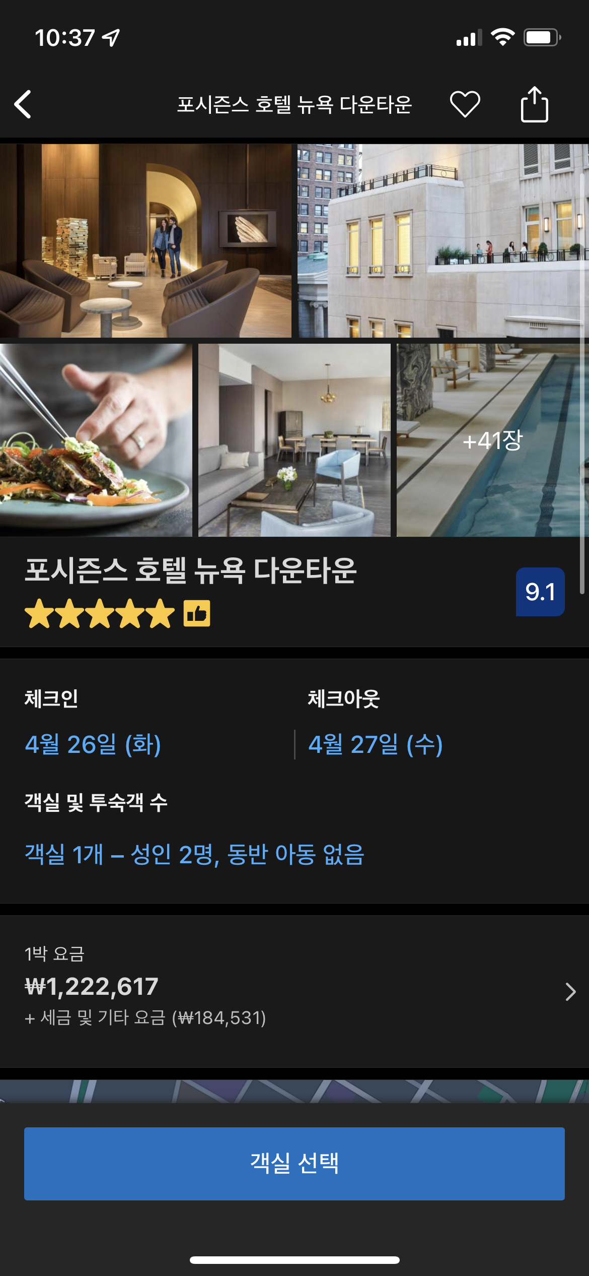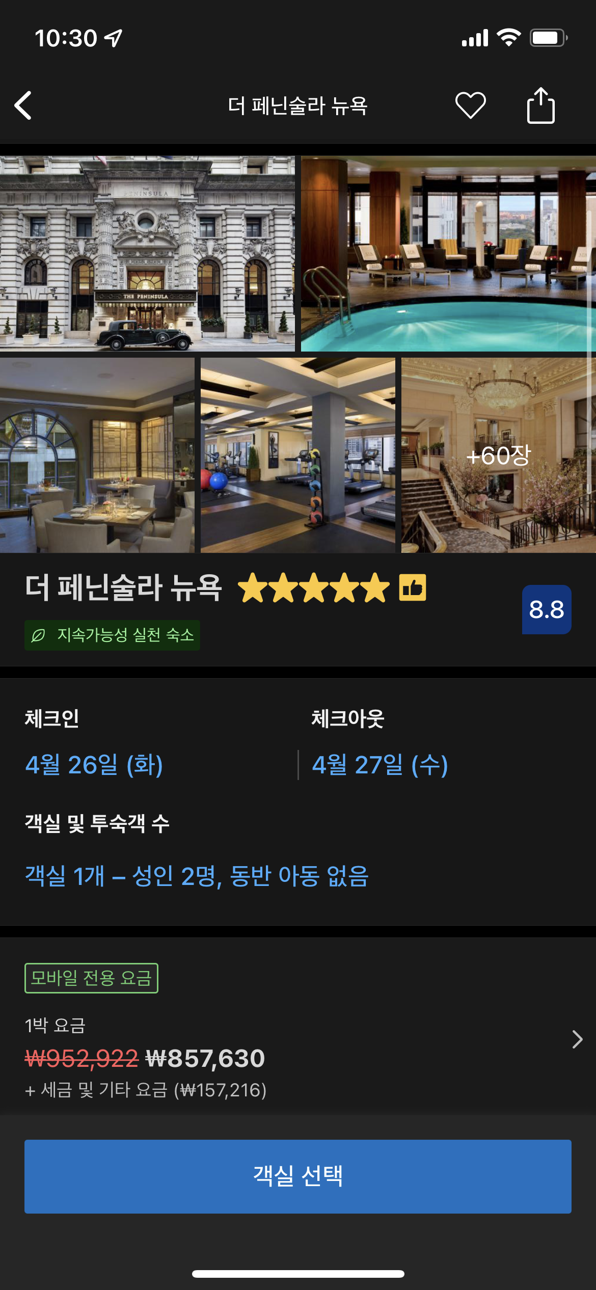 부킹에서 본 페닌슐라 뉴욕입니다. 제일 낮은 방의 룸레이트가 100만원을 자랑합니다.